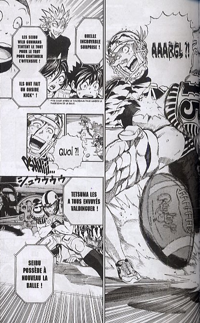Résumé: Afin de savoir à quelle sauce ils vont être mangés, les membres de Deimon assistent au match opposant les Dinosaurs aux Wild Gunmans, leurs anciens rivaux. L'occasion rêvée de voir à l’œuvre le monstrueux Gao, ce joueur de ligne qui écrase ses ennemis comme de vulgaires moucherons. Et c'est un véritable carnage en règle qui se produit sous les yeux horrifiés de Sena et de son équipe ! Quant à Kurita, il est directement défié par Gao en vue de leur prochain match. Quelle stratégie Deimon trouvera-t-il pour faire face à ce colosse ?