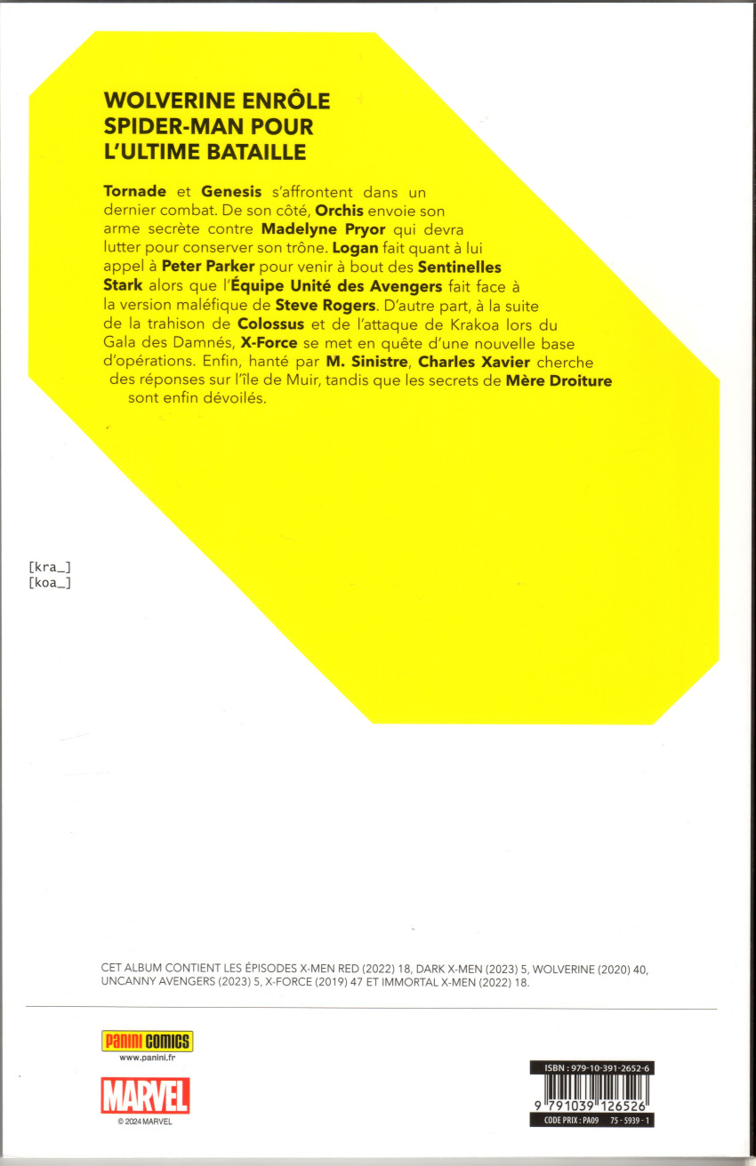 Résumé: Tornade affronte Genesis. Orchis envoie son arme secrète contre la Reine Démon, Madelyne Pryor. Logan fait appel à Peter Parker pour venir à bout des SentinellesStark. Suite à la trahison de Colossus, X-Force se met en quête d’une nouvelle base d’opérations. Enfin, hanté par M. Sinistre, Charles Xavier cherche des réponses sur l’île de Muir.