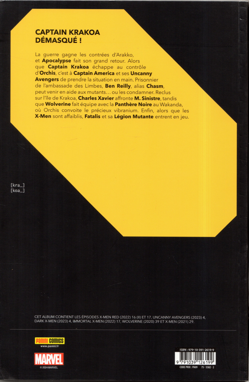 Résumé: Apocalypse fait son grand retour. Captain Krakoa étant devenu incontrôlable, ses alliés d’Orchis s’appuient sur CaptainAmerica et ses Uncanny Avengers pour prendre la situation en main. Ben Reilly, alias Chasm, peut venir en aide aux mutants… ou les condamner. Charles Xavier affronte M. Sinistre tandis que Wolverine fait équipe avec la Panthère Noire. Enfin, Fatalis entre en jeu.