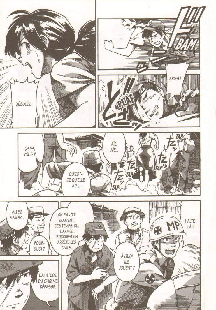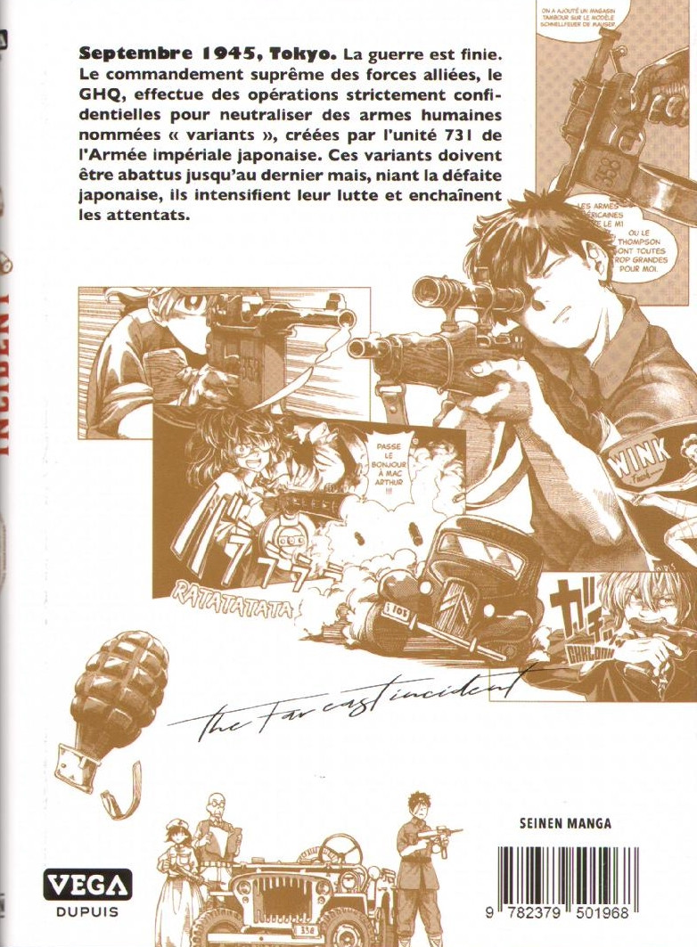 Ce premier tome de the far east incident est assez classique dans sa composition scénaristique. Il s'agit de mettre en place le lieu et les différents protagonistes de l'histoire. Ces derniers sont archétypaux et communs à ce qu'il est possible de trouver dans la production actuelle : à savoir un duo principal ayant une forte différence d'âge et de caractère qui va s'amadouer progressivement au fur et à mesure des révélations faites sur les passés respectifs, un chef rigolo, une alliée bimbo mais efficace...il n'y a pas de quoi se démarquer sur ce point là. Néanmoins, l'intérêt du titre est d'avoir choisi d'utiliser la tristement célèbre unité 731 dans le récit. Dans un pays qui a encore un souci avec la mémoire du conflit et de ces crimes, le choix peut paraitre audacieux. Toutefois, les jeunes lecteurs pourraient croire que cette unité de scientifiques protégés après la guerre, se serait limitée à créer des surhommes pour la guerre à l’image du projet fontaine de vie du gouvernement nazi. Il n'en est rien. L'avantage est donc que cela peut amener les plus curieux à se renseigner sur ce qu'était réellement cette branche de l'armée du Grand Japon, par exemple en regardant l'épisode que la série Horror humanum est sur YouTube lui consacre. Cette limite permet, peut-être, à l'auteur d'éviter quelques ennuis avec les révisionnistes de son pays. L'autre point d'intérêt est d'évoquer les relations occupants/occupés dans l'immédiat après-guerre. Attention, il ne s'agit pas de l'axe principal du manga, mais cela apparaît dans le background de certaines scènes et va jouer sur les relations entre plusieurs personnages.
