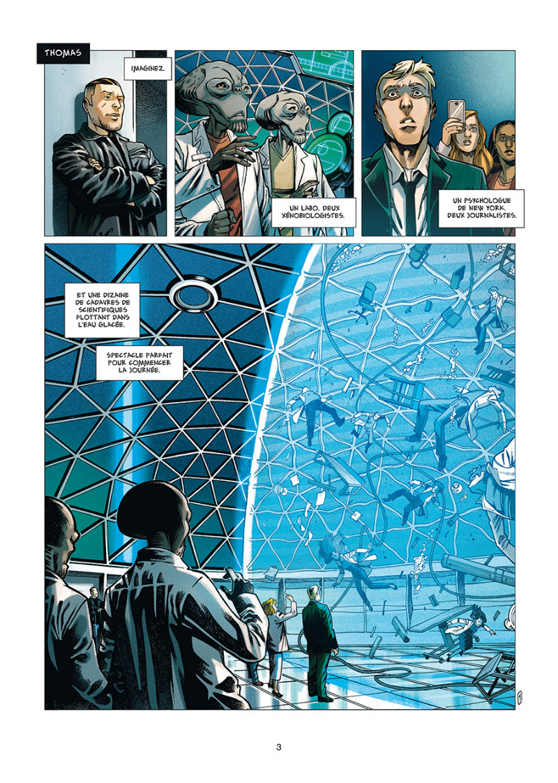 Comme Le Test, la très bonne entrée en matière de Fédération, New York Underwater est également tirée du roman éponyme de G. Elton Ranne. La transition, généralement délicate entre deux premiers tomes, se fait naturellement et sans réelle difficulté, et ce, grâce à une narration explicite et astucieuse alternant les changements notifiés d'interlocuteurs avec les deux principaux personnages. Sorte de huis clos abyssal, la fiction ouvre son hublot à une lieue sous les mers. L'entente entre l'espèce humaine et les aliens y a construit une base sous-marine perfectionnée, entièrement consacrée aux recherches conjointes sur l'hybridation et sur les expériences censées perfectionner les esprits et les conditions d'existence des populations. Cette alliance et la cohabitation qui est loin de faire l'unanimité provoquent des opérations coup de poing, souvent concrétisées par des attentats sanglants commis par des patriotes réclamant l'autonomie de la Terre. Au-delà de l'allusion et la dénonciation évidente des guerres de territoires et de la revendication d'identité qui perdurent depuis la nuit des temps, l'approche de l'auteur demeure créative, séduisante et servie sur un rythme soutenu.