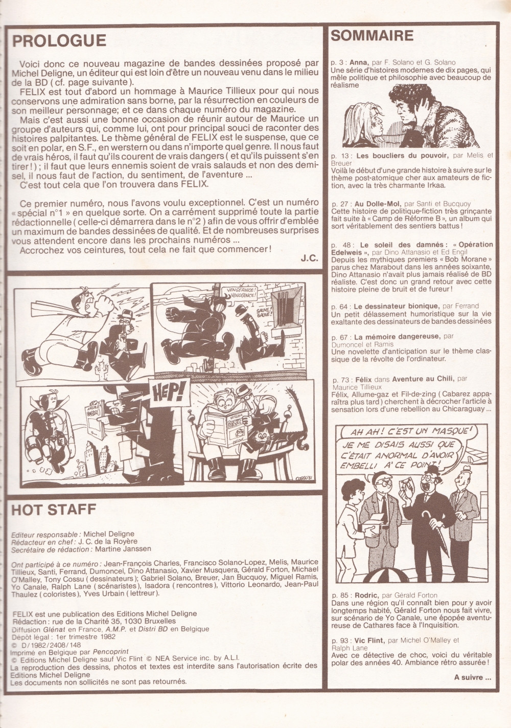 - Info édition : © Editions Michel Deligne sauf Vic Flint © NEA Service Inc. by. A.L.I. Dépôt légal : 1er trimestre 1982. D/1982/2408/148. Imprimé en Belgique par Pencoprint.