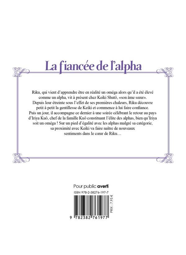 Résumé: Riku, qui vient d'apprendre être en réalité un oméga alors qu'il a été élevé comme un alpha, vit à présent chez Keiki Shutô, son âme soeur. Depuis leur étreinte sous l'effet de ses premières chaleurs, Riku découvre petit à petit la gentillesse de Keiki et commence à lui faire confiance. Puis un jour, il accompagne ce dernier à une soirée célébrant le retour au pays d'Iriya Kuô, chef de la famille Kuô constituant l'élite des alphas, bien qu'Iriya soit un oméga ! Sur un pied d'égalité avec les alphas malgré sa catégorie, sa proximité avec Keiki va faire naître de nouveaux sentiments dans le coeur de Riku...