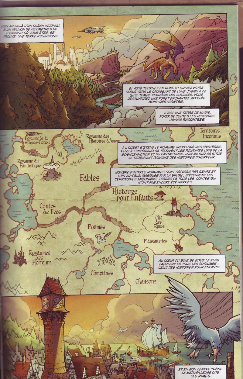 Le scénariste Paul Jenkins s’amuse avec le catalogue traditionnel des fables enfantines, en les transfigurant façon film noir. Le décalage provient du parti-pris de narration, montrant Franckie Mack aux prises avec un monde dont il ne comprend que partiellement les ficelles. A travers ses yeux et sa voix off, le lecteur découvre les intrigues politiques et judiciaires de cette région de Bois-des-Contes : celles des Histoires pour enfants. Le mélange des genres fonctionne très bien, les personnages rencontrant tout au long de l’album des figures connues, et forcément détournées par l’auteur : Alice est le chef d’un gang, Pinocchio un indic, Tom Pouce est capitaine de la police etc.