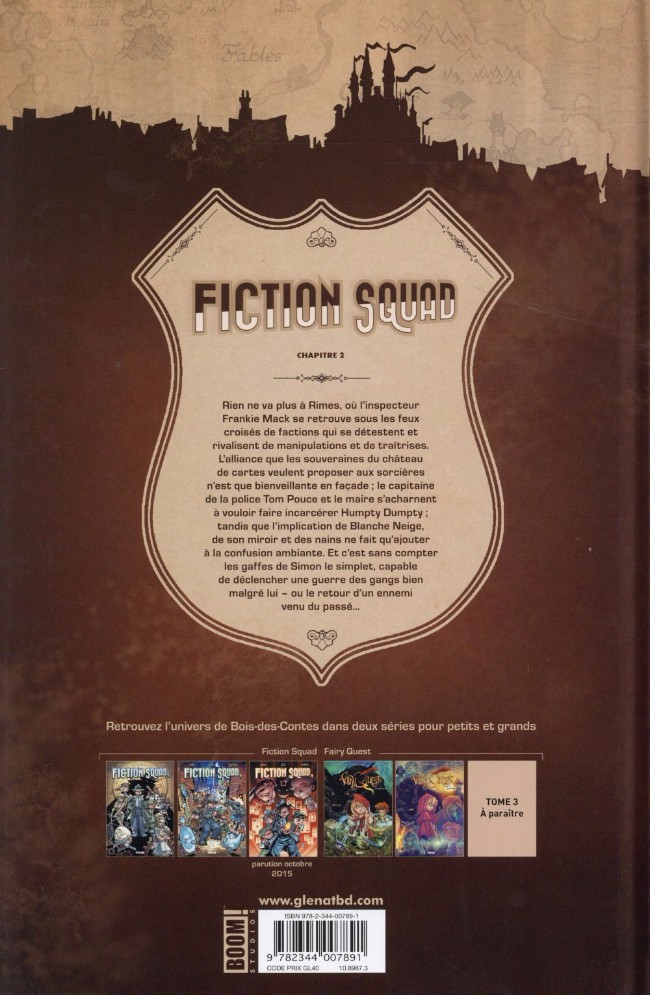 Résumé: Il était une fois... un meurtre ! Bien quelle ait placé Humpty en garde à vue pour le meurtre de la sorcière dEastide, la police est loin den avoir fini avec cette affaire... Sans la loi de son côté, linspecteur Frankie Mack doit prendre les choses en main et trouver un moyen de mettre un terme à cette guerre de territoire avant quil ne soit trop tard. Quelquun cherche à mettre la ville sens dessus dessous et cest à Frankie de le débusquer, avant quune nouvelle figure de contes ne morde la poussière de fées !À peine deux mois après la sortie du premier tome, voici déjà le deuxième épisode de Fiction Squad, par le créateur de Fairy Quest ! Dans cet univers de contes de fées réinventé façon polar noir, chaque comptine commence par... un crime !