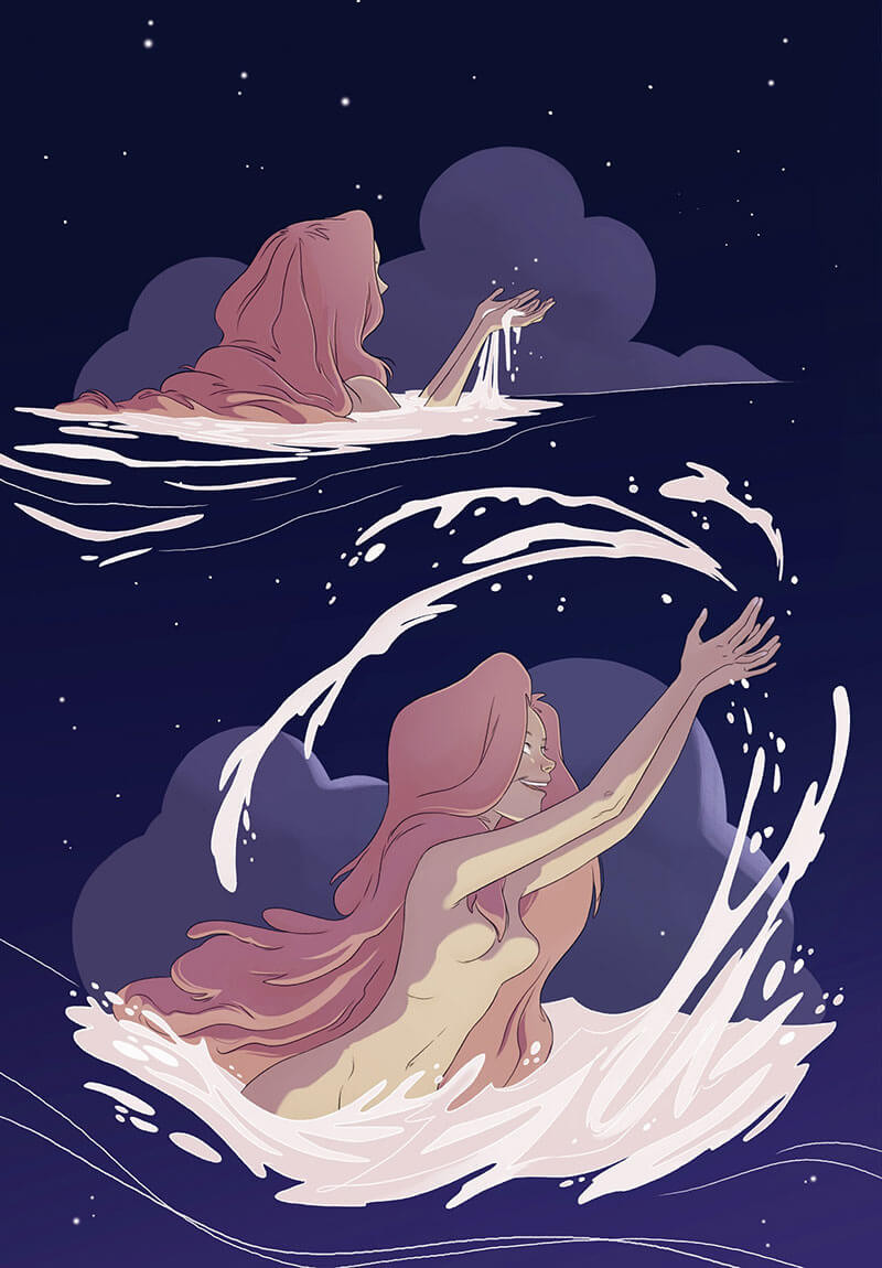 Pour évoquer le sujet difficile de grave de la maladie mentale, Greta Xella a choisi la forme du conte. Elle y a intégré tous les éléments qui en font la richesse, l’intérêt et qui donnent envie d’y revenir. Ce faisant, elle a créé un univers baignant dans le fantastique et chargé de mystère. Après une introduction aussi poétique qu’intrigante, le récit montre une enfant enjouée pour, quelques pages suivantes laisser percevoir les premières failles. Puis, tout s’enchaine, entrainant l’héroïne – et le lecteur avec – dans une quête initiatique forte en péripéties et en émotions. Le trouble de la mère est également bien raconté et mis en image par l’autrice italienne qui montre sa progressivité, ses effets sur la relation et les dégâts d’un épisode cataclysmique où la noirceur ébranle et stupéfie. Le voyage qui s’ensuit est constitué de rencontres, providentielles ou inquiétantes, qui permettent à la principale protagoniste de grandir et de relever les défis, en s’affranchissant petit à petit de la peur et des doutes. Enfin, la résolution possède une portée symbolique particulièrement éloquente.
