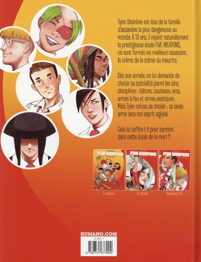 Résumé: Tyler Shainline est issu de la famille d’assassins la plus dangereuse au monde. À 13 ans, il rejoint naturellement la prestigieuse école Five Weapons, où sont formés les meilleurs assassins, la crème de la crème du meurtre. À son arrivée, on lui demande de choisir sa spécialité parmi les cinq disciplines : bâtons, lames, arc, armes à feu et armes exotiques. Mais Tyler refuse de choisir parmi ces options : sa seule arme sera son esprit aiguisé. Cela lui suffira-t-il pour survivre dans cette école de la mort ?