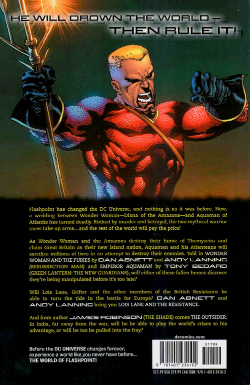 Info édition : Noté « First printing" en page 6 - Contient: Flashpoint : Emperor Aquaman (2011) #1- 3, Flashpoint : Outsider (2011) #1-3, Flashpoint : Lois Lane and the resistance (2011) #1-3 et Flashpoint : Wonder Woman and the furies (2011) #1-3.