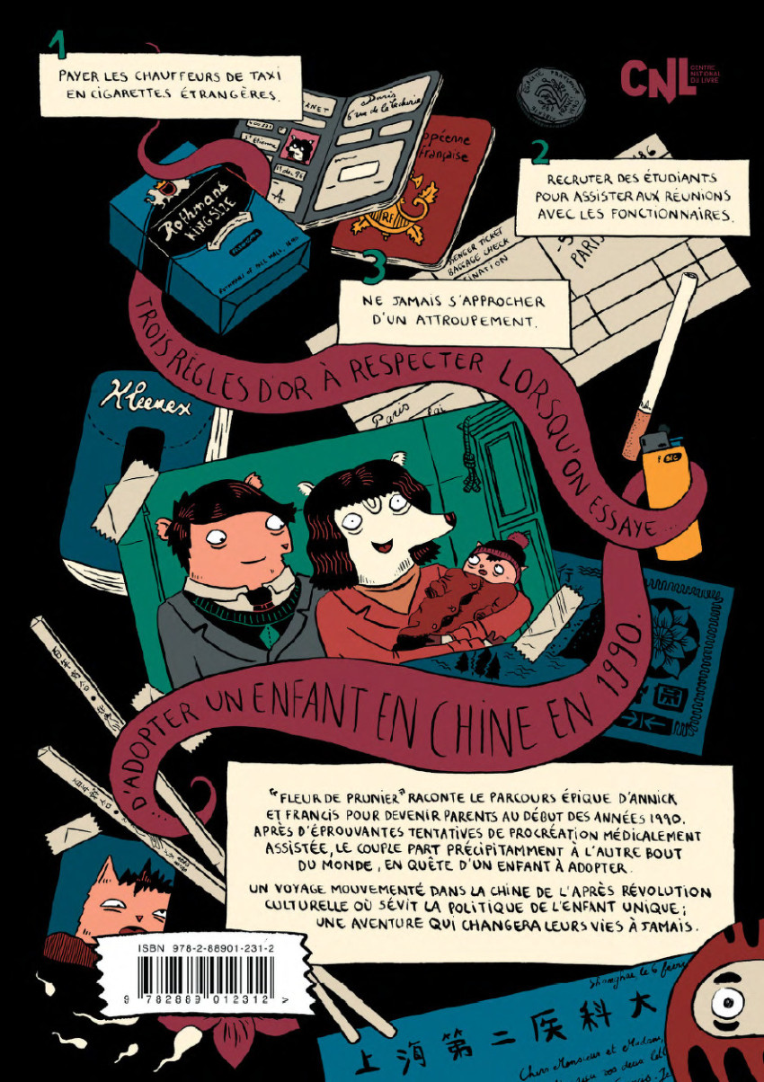 Maou – la vraie Meili – a pris la place de sa mère pour raconter les péripéties qui ont mené à son arrivée au sein d’une famille française. Classiquement agencé, le récit suit ce couple lambda dans toutes les étapes et épreuves qu’il ont dues traverser. Visites médicales éprouvantes et accompagnements psychologiques discutables, tentatives infructueuses de fécondation in vitro alors balbutiantes, avant d’accepter son sort et de choisir une autre voie pour avoir un enfant tellement désiré. La suite du scénario se déroule en Chine populaire, encore très fermée à l'époque : choc culturel, incompréhensions permanentes et, heureusement, de nombreuses rencontres et coups de mains de la part d’inconnus serviables et, finalement, le happy end. Le témoignage est assurément sincère et habité. Cependant, sur la longueur, il se révèle passablement attendu et sans réelle surprise. En effet, ces dernières années, tant les problèmes de procréation que les galères de voyages ont souvent été évoqués en bande dessinée et malgré toutes ses qualités, Fleur de prunier n’apporte rien de vraiment nouveau.