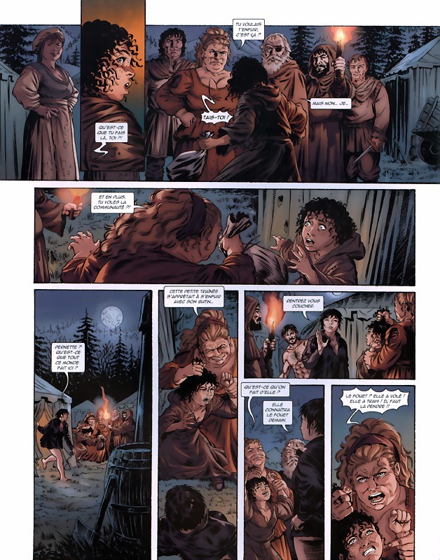 Résumé: Fuyant la colère meurtrière de l’évêque Thibault dAussigny, François et Félyzée mènent la dure vie des fuyards ; sales, affamés, la moindre intempérie les accable un peu plus encore. Cachés au fond d'un bois, ils peuvent à peine se supporter eux-mêmes, alors c'est la providence qui leur indique ce campement installé non loin deux, et même l'irrésistible fumée qui sort d'une tente qui ne peut être que la cuisine. Ils décident de s'y introduire prestement pour dérober de quoi apaiser leurs crampes. Mais trop épuisés pour demeurer vigilants, ils se font prendre et peinent à stopper l'ardeur des assaillants. Une femme arrête alors le combat d'autorité, et leur propose de faire le bon choix : soit les aider à rétablir la véritable autorité de Christ sur terre, ou alors être crucifiés pour les avoir attaqués. Cette jeune femme charismatique est la Nouvelle Jeanne : Christ lui-même guide son épée, tout en procurant à tous ceux qui la suivent un toit, de la nourriture, et un sens à leur vie.