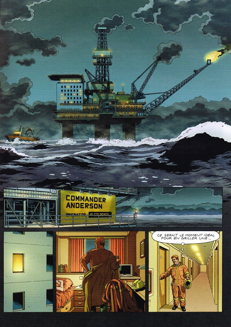 Idée très intéressante que de situer une enquête policière dans le monde confiné d'une plate-forme off shore. L'histoire -assez linéaire- n'est pas complètement à la hauteur des dessins. Néanmoins les dernières planches qui narrent l'entrevue de Frank et du ponte de la mafia en Alaska relancent complètement la quête de Frank pour son épouse.BDGest 2014 - Tous droits réservés
