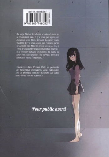 Résumé: Au café Statice, les clients se suivent mais ne se ressemblent pas.. Il y a ceux qui, après une discussion avec Hiro, décident d'assumer leurs pulsions. Il y a ceux, aussi, qui réalisent qu'ils ne doivent pas. Mais le gérant du café, lui, à force de fréquenter tous ces individus, pourra-t-il se contrôler pendant longtemps ? Et quand sa soeur fera une nouvelle fois surface, devra-t-il commettre encore l'impensable ? Découvrez dans Freaks' Café les portraits de paraphiles ordinaires, dont l'attirance ou la pratique sexuelle différent des actes considérés comme normaux.