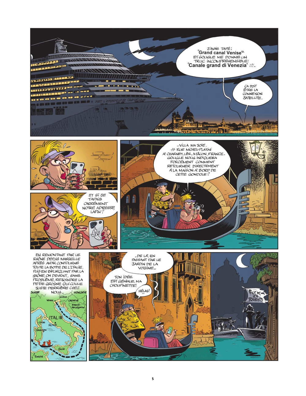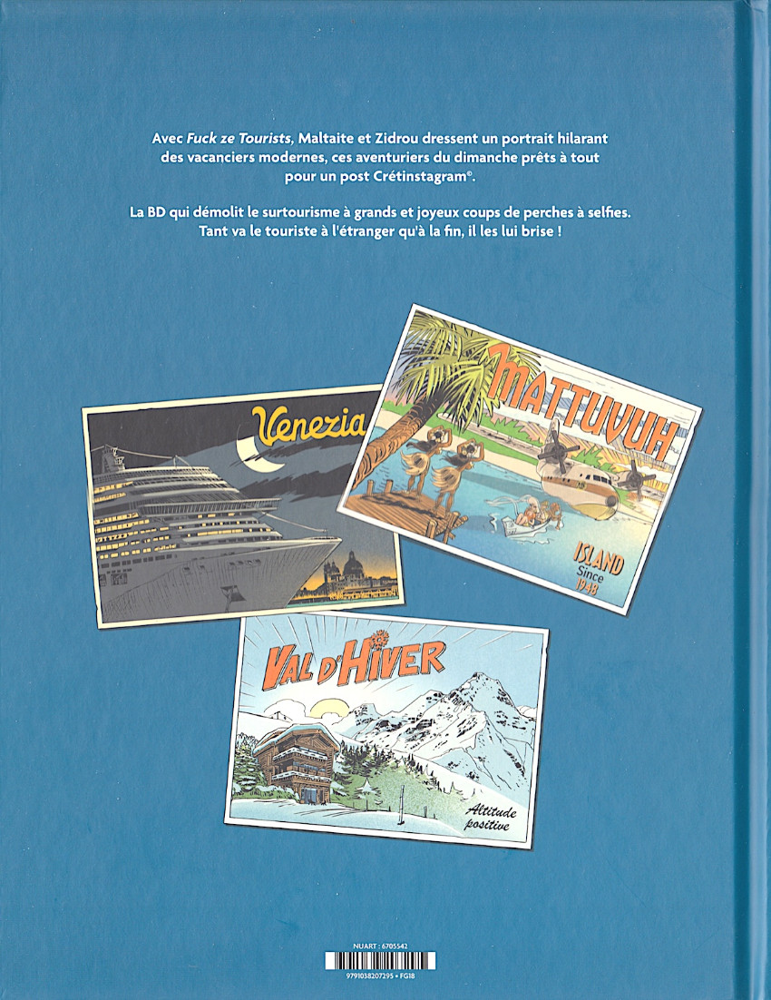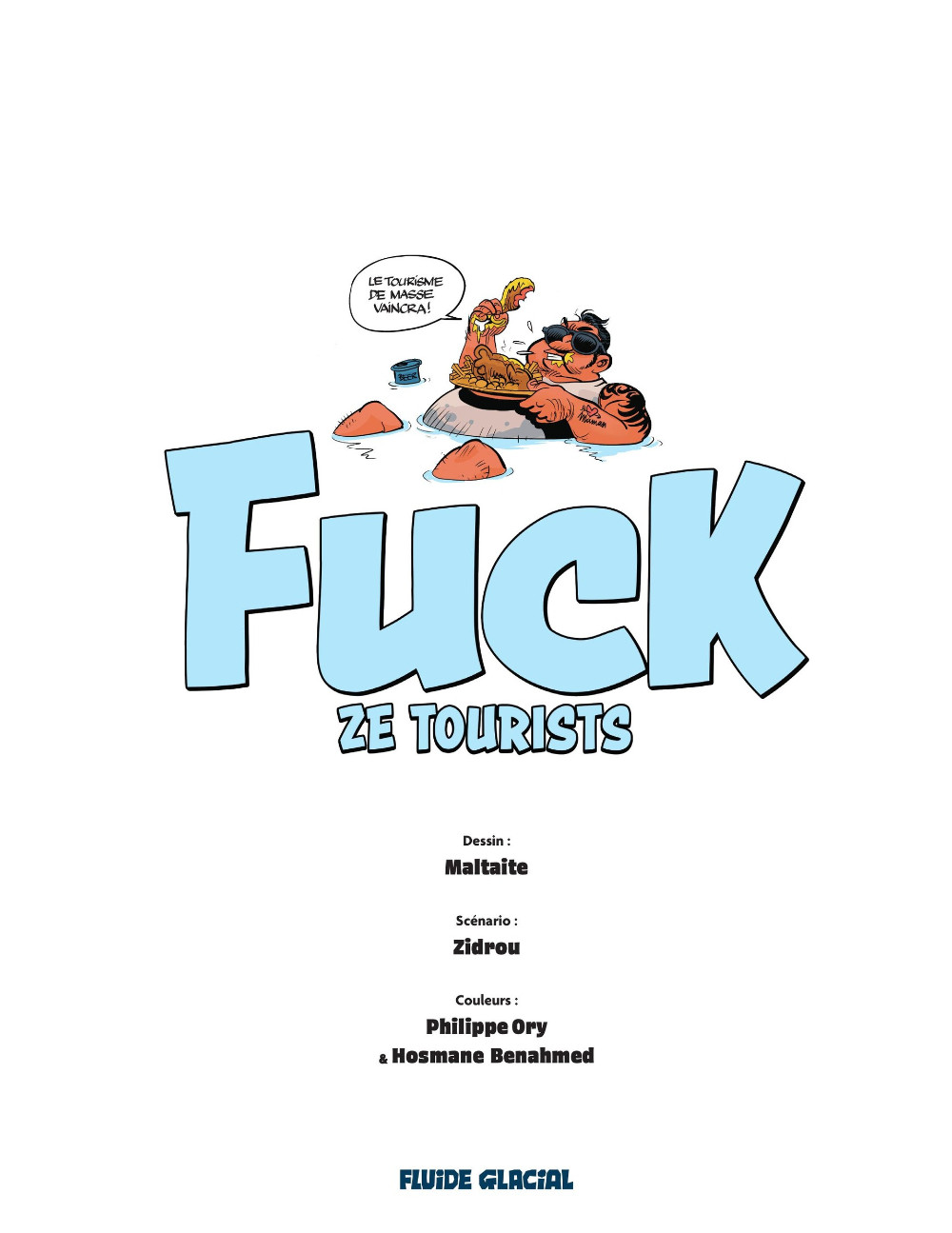 e sur-tourisme, ce n’est pas bien, ça dénature les plus beaux sites, ça pollue et, paradoxalement, tend à uniformiser la planète en répondant aux exigences formatées des voyageurs. Voilà, c’est dit et, comme le chantait haut et fort le courageux Florent Brunel : «Il faut prendre partie pour une cause, y aller à fond et prendre des risques, sinon ce n’est pas la peine». Zidrou et Éric Maltaite ne font pas dans la chanson engagée, mais de la BD rigolote et nuancée : Fuck ze tourists est leur cri du cœur.