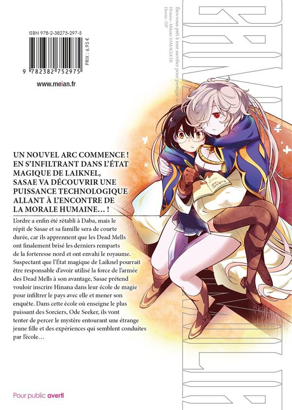 Résumé: Un nouvel arc commence ! En s'infiltrant dans l'État magique de Laiknel, Sasae va découvrir une puissance technologique allant à l'encontre de la morale humaine... !L'ordre a enfin été rétabli à Daba, mais le répit de Sasae et sa famille sera de courte durée, car ils apprennent que les Dead Mells ont finalement brisé les derniers remparts de la forteresse nord et ont envahi le royaume. Suspectant que l'État magique de Laiknel pourrait être responsable d'avoir utilisé la force de l'armée des Dead Mells à son avantage, Sasae prétend vouloir inscrire Hinana dans leur école de magie pour infiltrer le pays avec elle et mener son enquête. Dans cette école où enseigne le plus puissant des Sorciers, Ode Seeker, ils vont tenter de percer le mystère entourant une étrange jeune fille et des expériences qui semblent conduites par l'école...Pour le bien de son pays, elle va offrir son corps au démon !Que l'opération d'infiltration de l'école de magie commence !!