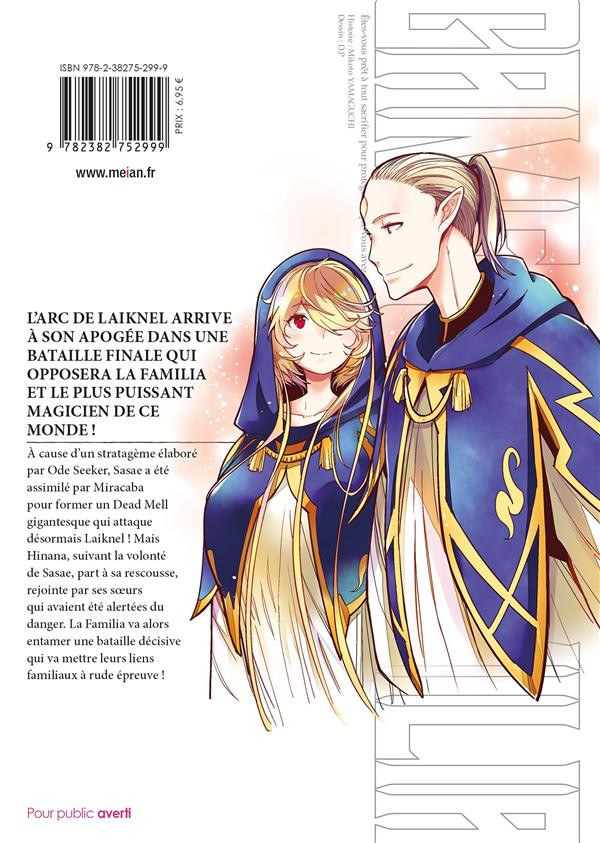Résumé: L'arc de Laiknel arrive à son apogée dans une bataille finale qui opposera la Familia et le plus puissant magicien de ce monde !À cause d'un stratagème élaboré par Ode Seeker, Sasae a été assimilé par Miracaba pour former un Dead Mell gigantesque qui attaque désormais Laiknel ! Mais Hinana, suivant la volonté de Sasae, part à sa rescousse, rejointe par ses soeurs qui avaient été alertées du danger. La Familia va alors entamer une bataille décisive qui va mettre leurs liens familiaux à rude épreuve !Alors que les idéaux s'entrechoquent, l'arc de Laiknel approche de son apothéose !!