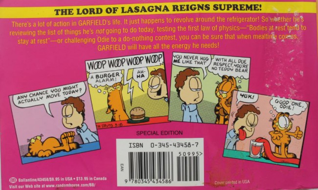 Résumé: There’s a lot of action in Garfield’s life. It just happens to revolve around the refrigerator! So whether he’s reviewing the list of things he’s not going to do today, testing the first law of physics—“Bodies at rest tend to stay at rest”—or challenging Odie to a do-nothing contest, you can be sure that when mealtime comes, Garfield will have all the energy he needs!
