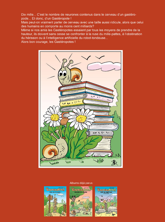 Même si nos amis les Gastéropotes essaient par tous les moyens de prendre de la hauteur, ils doivent sans cesse se confronter à la ruse du mille-pattes, à l’obstination du hérisson ou à l’intelligence artificielle du robot-tondeuse...