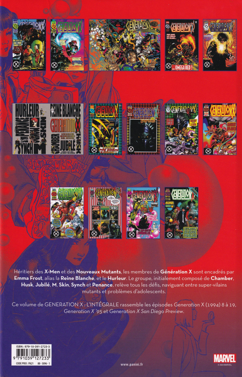 Résumé: La nouvelle génération de X-Men va devoir se dépêcher de grandir ! Génération X accueille dans ses rangs un nouveau mutant, Mondo, mais voilà qu'Omega Red attaque ! Ce n'est pas tout : Emplate (le frère maléfique de M) menace, alors que le Hurleur est grièvement blessé et qu'Emma Frost est prête à tout pour protéger les enfants d'Onslaught ! Nous retrouvons l'équipe qui a modernisé le concept des mutants dans les années 90, avec des jeunes en phase avec leur époque et un dessin résolument moderne.