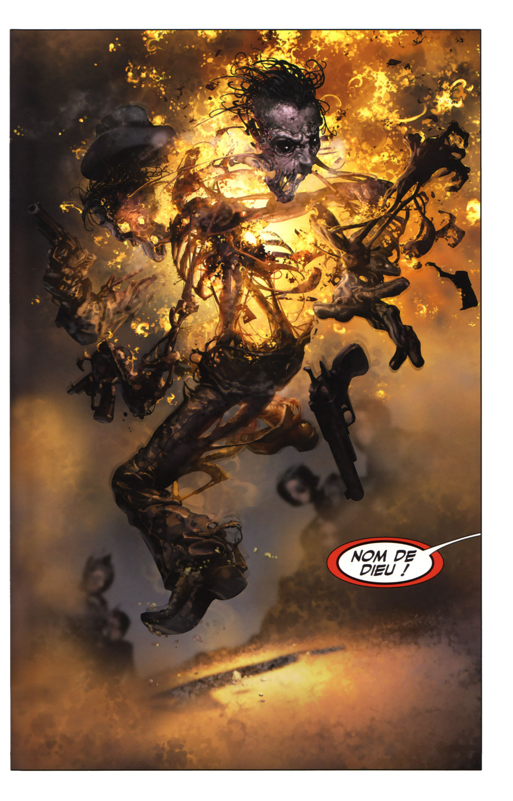 La volonté de corriger l'injustice n'appartient pas à l'époque moderne. Rien de surprenant alors de retrouver le Ghost Rider à une période troublée de l'histoire américaine, à ceci près que le biker laisse la place à un cavalier chevauchant un destrier aux naseaux de feu. Garth Ennis avait la lourde tâche de faire oublier les précédents albums et notamment le décevant Cercle Vicieux. Le contrat est rempli avec un scénario à la hauteur du personnage, en proie au doute et aux contradictions face à sa mission. La transposition à une autre époque se révèle vite bénéfique car elle permet d'aborder d'autres aspects du mythe du Ghost Rider et notamment le processus qui mène à la haine et le désir de revanche. L'auteur délaisse complètement le personnage connu pour en créer un autre. La bonne idée est d'avoir utilisé Parham comme acteur principal de l'intrigue et de développer autour de lui le chemin qui va l'amener à renoncer à ses principes, en mémoire de celui qui était devenu son ami. Le récit se présente comme un très bon western à l'ambiance très noire où chaque page voit Travis se rapprocher de la damnation. Le Lieutenant sudiste va traquer un par un les hommes responsables du massacre de cette famille noire, mais alors qu'il approche de son but, il découvre qu'il n'est pas le seul à poursuivre cet objectif. Ami ou ennemi, cet étrange cavalier le devance à chaque fois.