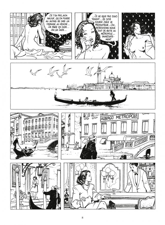 Résumé: À la recherche de la grande aventure ! Giuseppe Bergman en avait assez de vivre entravé par sa vie morose et sans aucun sens, et a tout plaqué pour vivre l'aventure avec un grand A. Après Venise et l'Afrique, le voici cette fois en Inde, oscillant à nouveau entre songe et réalité. Toujours inspiré par ses mentors et amis Hugo Pratt et Fellini, Manara propose dans cet album un récit plus linéaire que les précédents. Tout commence lorsque la magnifique Francesca Foscari est missionnée par sa société de production cinématographique pour retrouver les membres d'une équipe de tournage, perdue corps et bien dans les replis mystiques du sous-continent. Parmi les trois hommes qui l'accompagnent se trouve bien sûr Giuseppe Bergman. Et en compagnie de Bergman et Manara, impossible que l'aventure naille pas flirter avec l'érotisme et le rêve... Une uvre unique, troublante et révolutionnaire.
