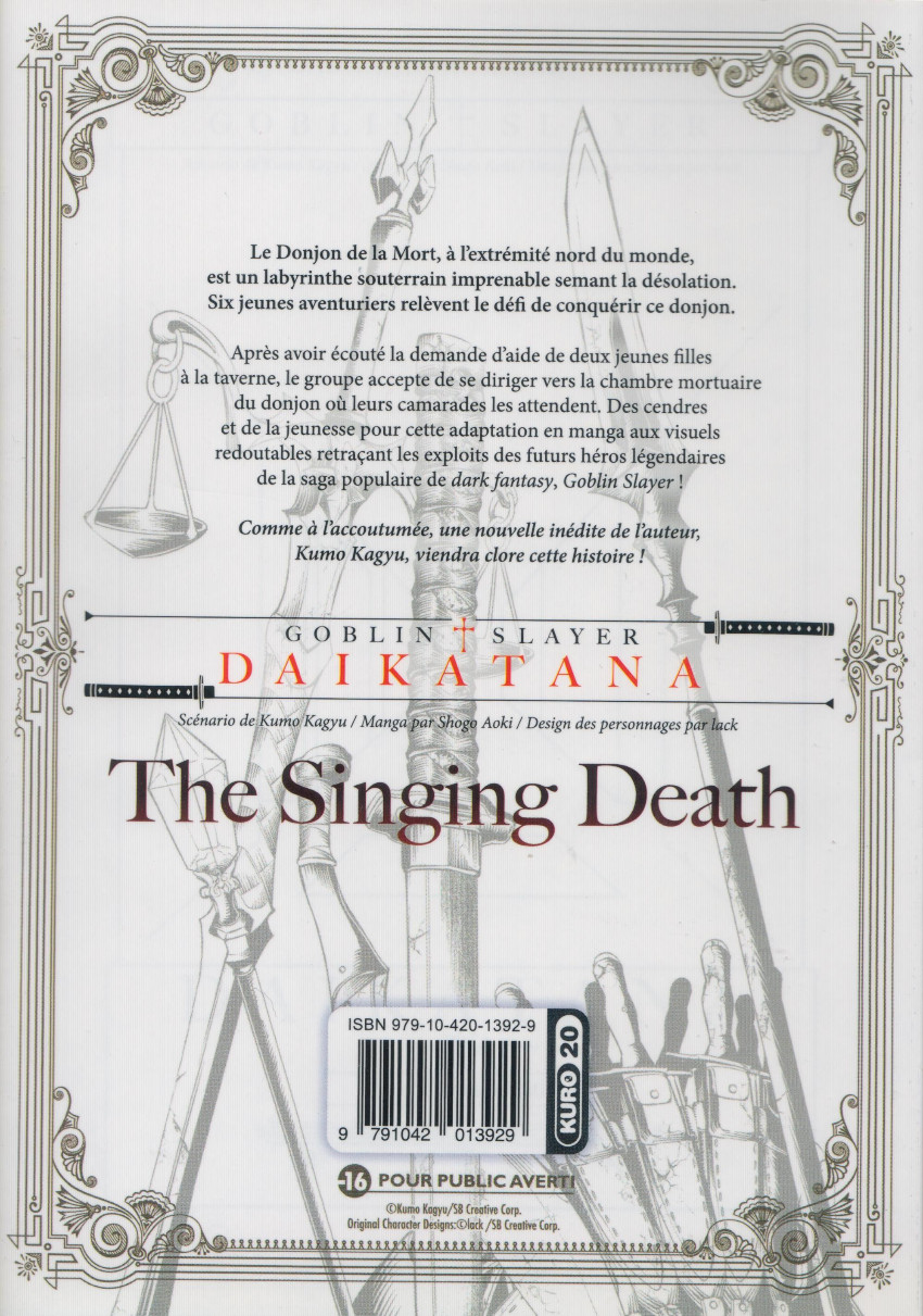 Après avoir écouté la demande d'aide de deux jeunes filles à la taverne, le groupe accepte de se diriger vers la chambre mortuaire du donjon où leurs camarades les attendent. Des cendres et de la jeunesse pour cette adaptation en manga aux visuels redoutables contant les exploits des futurs héros légendaires de la saga populaire de dark fantasy, Goblin Slayer !