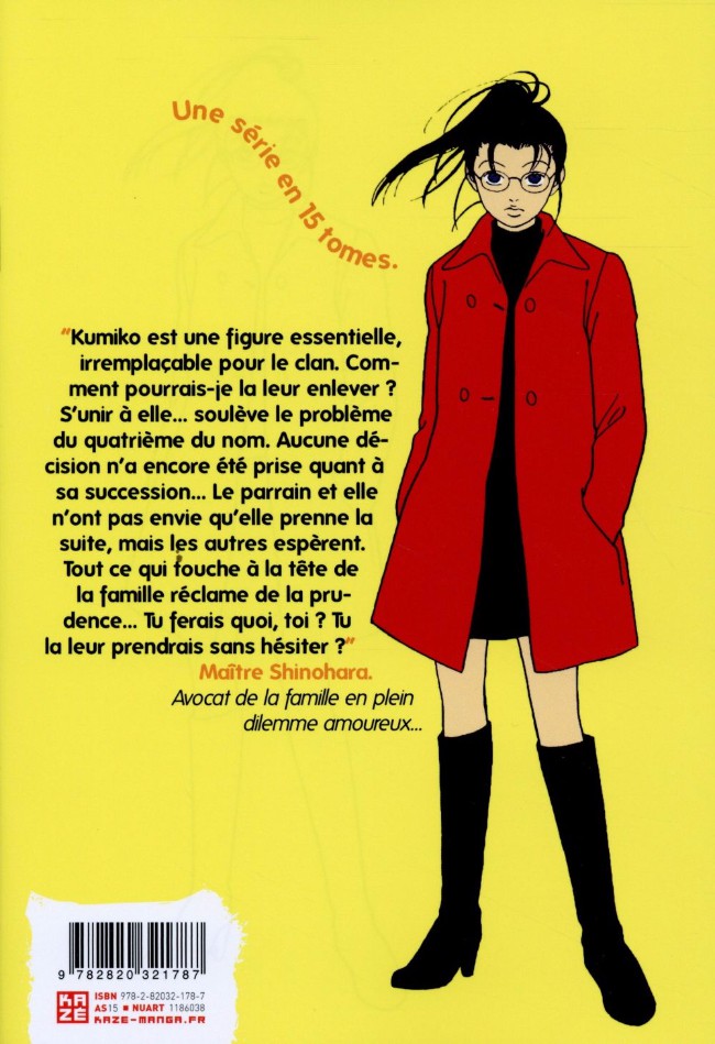 Résumé: "Kumiko est une figure essentielle, irremplaçable pour le clan. Comment pourrais-je la leur enlever ? S'unir à elle. soulève le problème du quatrième du nom. Aucune décision n'a encore été prise quant à sa succession. Le parrain et elle n'ont pas envie qu'elle prenne la suite, mais les autres espèrent. Tout ce qui touche à la tête de la famille réclame de la prudence. Tu ferais quoi, toi ? Tu la leur prendrais sans hésiter ?". Maître Shinohara, avocat de la famille en plein dilemme amoureux.