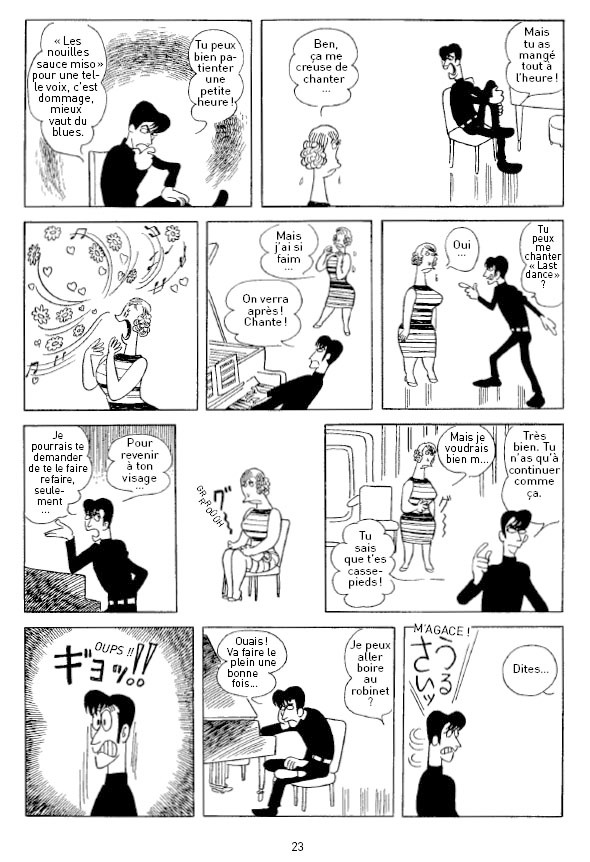Osamu Tezuka était-il amer et désillusionné par rapport au microcosme artistique nippon de la fin des années soixante ? Probable au vu de La grande pagaille du Diletta, publié au Japon en 1968 et que les éditions FLBLB ont fait paraître au format d’un pavé de trois cent quatre-vingt six pages à l’automne 2013. Sur un mode caricatural, le créateur d’Astroboy y dépeint avec âcreté et sans aménité un univers du show-business et des média pour le moins impitoyable, peu enclin aux états d’âme ou aux problèmes de conscience. Si les actes de certains personnages ou leur façon d’être peuvent sembler outrageusement excessifs, la critique n’en possède pas moins un caractère troublant qui pique au vif, parce qu’elle trouve des échos aujourd’hui encore.