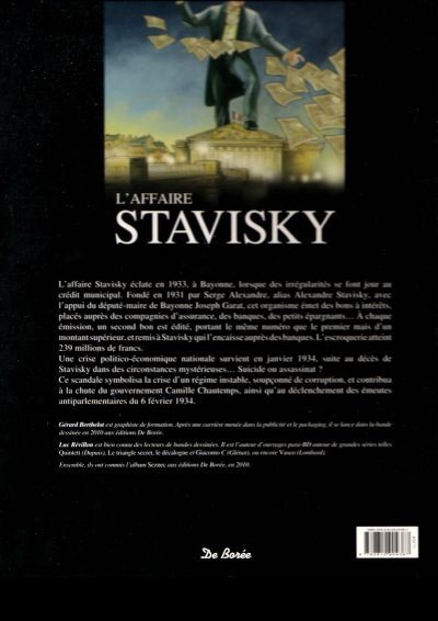 Résumé: En 1931, Serge Alexandre, alias Alexandre Stavisky, fonde, avec l’appui du député-maire de Bayonne, Joseph Garat, un crédit municipal dans cette ville. Rapidement, cet organisme émet de nombreux bons à intérêts, placés auprès des compagnies d’assurance, des banques, des petits épargnants… Gustave Tissier, homme de confiance de Garat, à chaque émission de bon en émet un second portant le même numéro que le premier, mais d’un montant supérieur, qu’il remet à Stavisky qui l’encaisse auprès des banques. L’escroquerie atteint 239 millions de francs. Soudain, des irrégularités se font jour au crédit municipal. L’affaire Stavisky éclate, nous sommes en 1933.