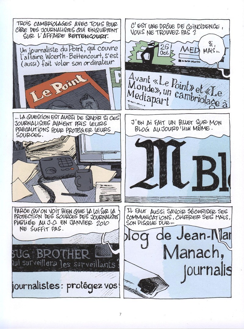 Une nouvelle "BD enquête" qui est un genre qui semble faire des adeptes depuis quelques temps auprès de certains journalistes (qui prennent leur métier et la BD au sérieux) et/ou d'auteurs qui aiment de tant à autre "dénoncer" les incohérences de notre société et des hommes qui la gère. Un sujet de fond très intéressant traité de manière claire et efficace sur les agissements d'une société Française spécialisée dans la commercialisation de systèmes de surveillance des télécommunications. Comme dans les meilleurs fictions, des affreux s'en mettent plein les poches au détriment de toute forme d'éthique et de moral, quand d'autres paient au prix fort leur liberté de penser et surtout de s'exprimer. Pas très rassurant, d'une part parce que ce n'est pas une fiction, et d'autre part car elle met en cause une nouvelle fois les dirigeants de notre "douce" France (qui reste encore le pays des droits de l'homme... mais pour combien de temps ?)BDGest 2014 - Tous droits réservés