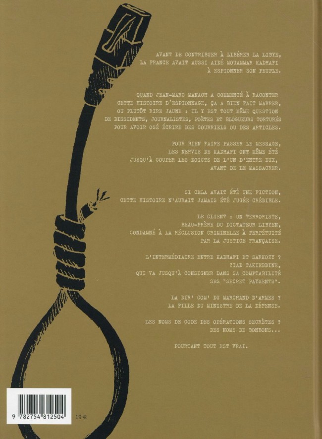 Jamais jusqu’ici, Nicoby n’avait été aussi loin. Il passe du domaine de la comédie à celui du journalisme d’investigation qui met la lumière sur l’un des plus gros scandales en France de toutes ces dernières années. Le sujet m’a particulièrement intéressé pour des motifs également professionnels. Il s’agit de la surveillance des e-mails de tout un pays. En effet, la France de Sarkozy aurait livré au dictateur libyen Kadhafi un système de surveillance généralisée dont ce dernier se serait servi contre ses opposants politiques. Il est vrai qu’au moment du printemps arabe, la ministre MAM avait voulu prêter son assistance à la police répressive du dictateur tunisien Ben Ali afin de mâter la rébellion. On est dans le même registre mais cela va plus loin car ce n’est pas seulement une déclaration d’intention mais des faits avérés. Il est vrai que je suis complètement sidéré car j’ignorais ce qui se cachait derrière les affaires liées à la Libye et c'est plutôt grave. Les auteurs ont réalisé un formidable travail de restitution de l’information en prenant des faits objectifs. On se rend compte de toutes les interconnections entre l’affaire Karachi, la campagne électorale de Balladur que Sarkozy avait soutenu, l’homme d’affaire sulfureux Ziad Takiedine (qui ne paie pas d’impôts) et la Libye en remontant jusqu’à l’attentat de Lockerbie. Cette enquête va balancer pas mal de monde qui visiblement ne sont pas condamnés. Visiblement, on a considéré qu’un système de surveillance d’une population n’était pas à ranger dans la même catégorie que des armes. Or, quand on sait les effets produits, c’est totalement ignoble que d’avoir laissé passer cela et se retrancher derrière un vide juridique. Bref, le sujet porte sur les atteintes aux libertés organisées par les services de surveillance des états démocratiques. Il faut dire que les populations sont enclines à plus de sécurité et moins de liberté dans des périodes troubles comme des attaques terroristes. Sur le fond, la lecture n’a pas été des plus agréables malgré le dessin de Nicoby qui fait parfois dans l’humour. Sans doute, le sujet à traiter imposait d’autres choix ou un autre traitement. Ceci dit, cela n’enlève en rien la qualité de cette enquête.Le 02/01/2016 à 00:28:19