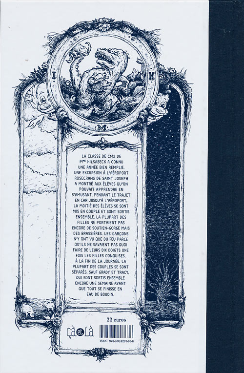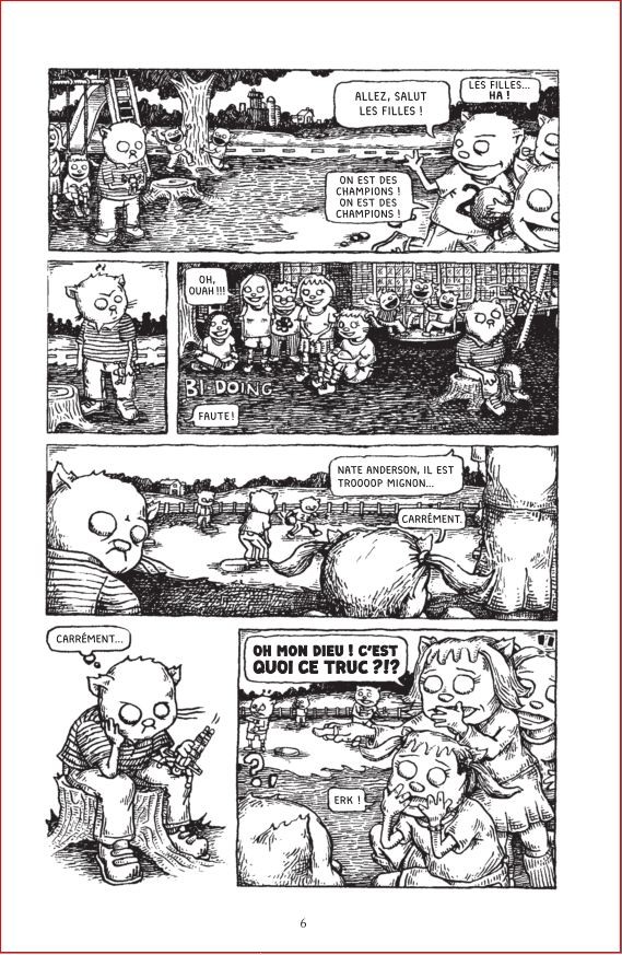 En optant pour des personnages aux visages ronds et à l’apparence féline, Cotter leur donne une apparence attachante (mais parfois trop ressemblante), qui contraste admirablement avec la dureté des thèmes abordés et avec la morosité de l’environnement ambiant. L’intégration d’extraits de journaux et de courriers de lecteurs issus de la feuille de chou locale, ainsi que de fausses publicités incitant ironiquement à consommer une marque de cigarettes conseillée par le corps médical, peut initialement sembler superflue, mais contribue à dépeindre le monde dans lequel évolue ce pauvre binoclard qui tente désespérément de fuir l’ennui et la frustration. Cette toile de fond composée de nombreuses annexes à l’histoire principale peut certes déstabiliser, mais permet néanmoins à l’auteur de livrer une critique sociale acerbe de cette partie des États-Unis où les silos à grain font office de gratte-ciel.