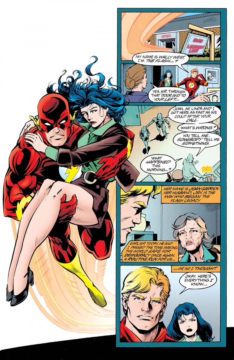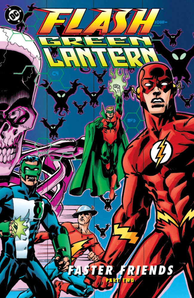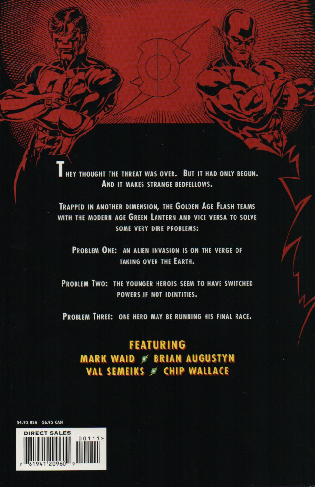 Résumé: Trapped in another dimension, the Golden Age Flash must team-up with the Modern Age Green Lantern, and the Golden Age Green Lantern must team-up with the Modern Age Flash, in order to avert an alien invasion of Earth. Interestingly, the younger heroes seem to have switched powers. Written by Mark Waid and Brian Augustyn, with pencils by Val Semeiks and inks by Chip Wallace.