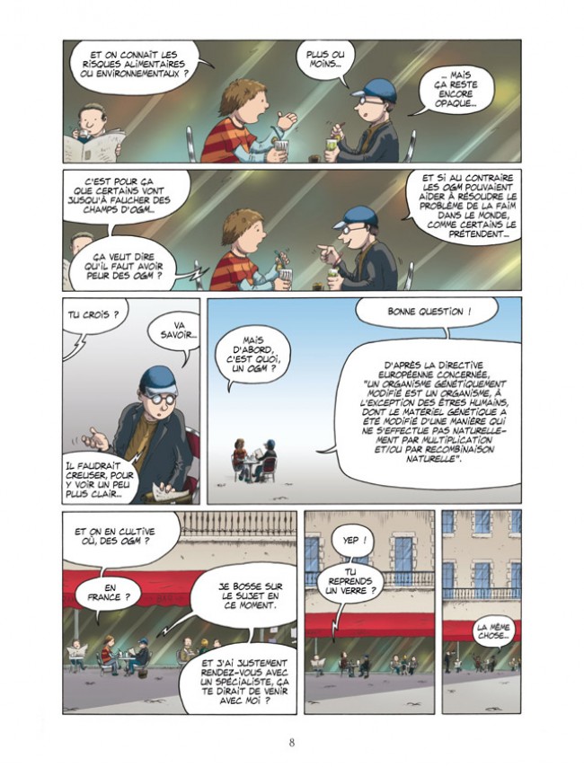 La guerre des OGM est une bd documentaire qui nous explique ce que sont ces fameux organismes génétiquement modifiés et pourquoi ils sont dangereux pour l'homme et son environnement. Il y a un véritable parti pris de la part des auteurs alors qu'au départ, j'espérais que cela reste plutôt neutre. C'est vrai que je croyais naïvement que les OGM étaient peut-être une solution aux famines à travers le tiers-monde et l'avenir d'une humanité en voie de surpopulation. J'ai plutôt confiance en la Science comme d'autres feraient confiance en la Foi divine. La démonstration des auteurs a été assez convaincante. Cela souligne bien les différents dangers ! Je comprends mieux les passions que cela déchaîne à travers le monde. Mais attention, je le répète : je n'approuve aucunement la violence par les actes et les voies de fait réalisés au mépris de la loi. Ce récit aborde également le combat de José Bové et d'autres leaders altermondialistes à travers le monde. Leurs méthodes sont plutôt musclées, on le sait. Ils se battent pour une cause qu'ils croient juste pour sauver la nature et l'homme. Il ne faut pas jouer aux apprentis sorciers avec les plantes ou sinon gare ! J'ai quand même encore un petit doute qui demeure. J'aimerais entendre la voix de ceux qui défendent les OGM pour pouvoir me faire une idée concrète. Si nos auteurs ont raison, cela ferait très peur et je n'ose pas croire un tel schéma catastrophique. Les OGM sont également utilisés à bon escient dans le domaine médical et pharmaceutique sans que cela ne pose de graves problèmes. Les auteurs ont pris soin de bien faire la distinction au début de leur démonstration. En tout cas, le débat est assez intéressant. Cette bd aura eu le mérite de m'apprendre de manière approfondie quels sont les véritables enjeux de la guerre des OGM. J'avais récemment visité une exposition assez mal faite je dois dire où je n'avais rien retenu de concret. Cette bd documentaire a été plutôt un bon moyen d'expression et de compréhension. J'ai bien aimé le fait que chaque aspect du problème a été étudié dans les différents chapitres : la définition, l'histoire, le cadre juridique et scientifique, la guerre industrielle ... Maintenant, je ne suis pas totalement dupe. Sous le couvert du progrès, une seule multinationale agricole ayant à coeur d'exploiter son brevet sur des organismes vivants peut entraîner un véritable bouleversement de la nature. Comme dit, il y a de quoi s'interroger !BDGest 2014 - Tous droits réservés
