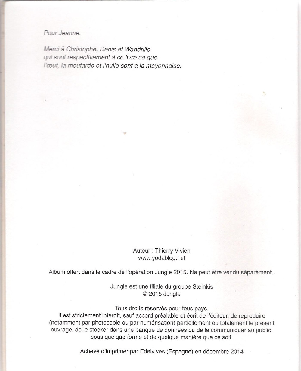 - Info édition : Album offert dans le cadre de l'opération Jungle 2015. Ne peut être vendu séparément. Pas de DL indiqué. Format petit poche.