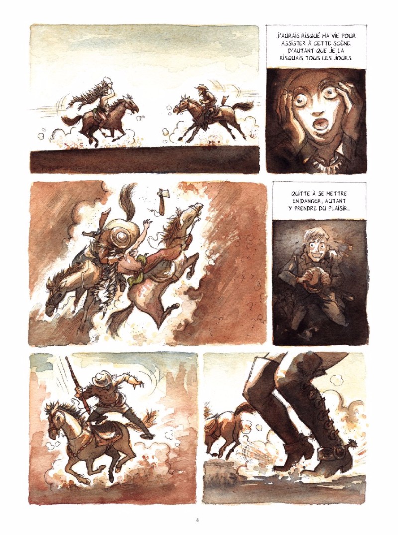 C’est un western assez étrange car il mêle un mineur du Nord de la France avec un peau-rouge du cirque de Buffalo Bill. Un jeune garçon essaie en effet d’échapper à son destin. L’intrigue entre l’enquête policière et la chronique sociale est savamment bien construite. Il sera également question du fameux débat concernant la séparation des Églises et de l’État en 1905. Cela va être une rencontre assez intéressante entre deux modes de vie totalement différents mais qui semblent combattre la même chose. Comme quoi, il peut y avoir des points d’accord malgré les différences. C’est une œuvre profondément humaine et assez bienveillante comme je les aime, comme une leçon de vie. Les thèmes me sont assez chers comme la tolérance et la solidarité dans un monde qui en manque cruellement. On y retrouve tout le vécu et l'ambiance des cités minières de l'époque. Au niveau du graphisme, j’ai quand même eu un peu de mal mais je m’y suis habitué au fil de la lecture. De manière générale, j’aime bien les couleurs directes à l’aquarelle. Ici, c’est surtout sombre et rouille. Quelques bémols cependant comme l’emploi du patois local (le ch’ti) qu’on aurait pu éviter. La conclusion sera plutôt cynique sur le fait que l’Europe sombrera dans une folie meurtrière. Une question se pose alors : qui sont alors les plus sauvages ? En tout cas, un mélange fort réussi qui rend ce western tout à fait original et surprenant.BDGest 2014 - Tous droits réservés