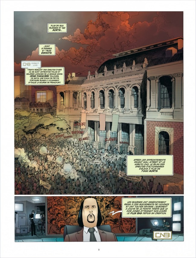 Le premier volet de cette trilogie d’anticipation plonge le lecteur dans un monde qui semble faire écho à la vague de mécontentement qui secoue actuellement une Europe du Sud frappée de plein fouet par la récession et soumise à des plans d’austérité draconiens. Des émeutes sociales éclatent partout, les bourses du monde entier s’écroulent et les sociétés licencient à tour de bras, mais dans cette grisaille économique, une seule valeur semble encore tirer son épingle du jeu : l’être humain.