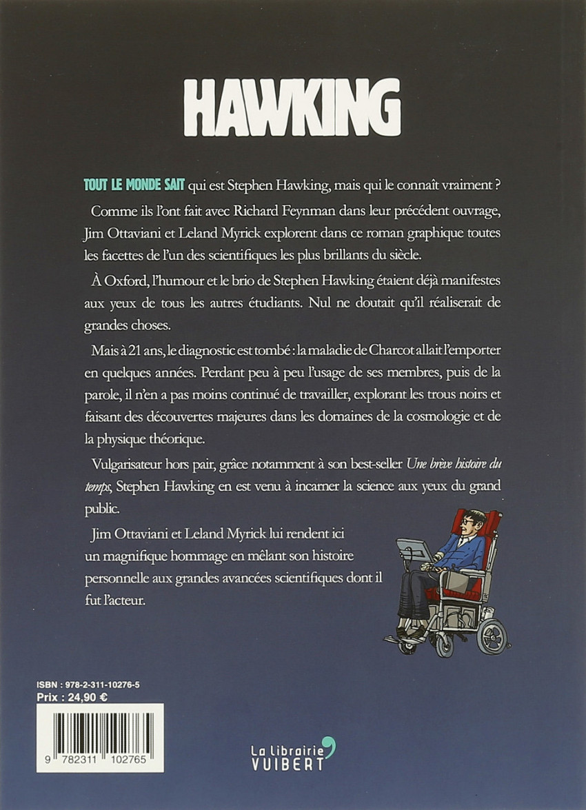 Résumé: Tout le monde sait qui est Stephen Hawking, mais qui le connaît vraiment ? Comme ils l’ont fait avec Richard Feynman dans leur précédent ouvrage, Jim Ottaviani et Leland Myrick explorent dans ce roman graphique toutes les facettes de l’un des scientifiques les plus brillants du siècle. À Oxford, l’humour et le brio de Stephen Hawking étaient déjà manifestes aux yeux de tous les autres étudiants. Nul ne doutait qu’il réaliserait de grandes choses.