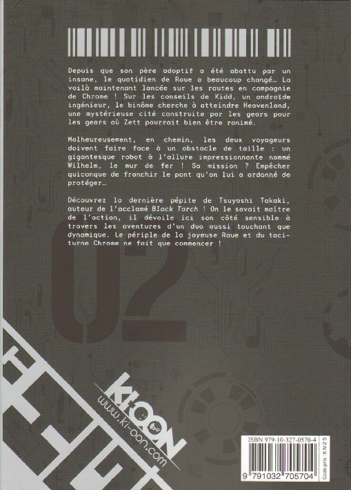 Découvrez la dernière pépite de Tsuyoshi Takaki, auteur de l'acclamé Black Torch ! On le savait maître de l'action, il dévoile ici son côté sensible à travers les aventures d'un duo aussi touchant que dynamique. Le périple de la joyeuse Roue et du taciturne Chrome ne fait que commencer !