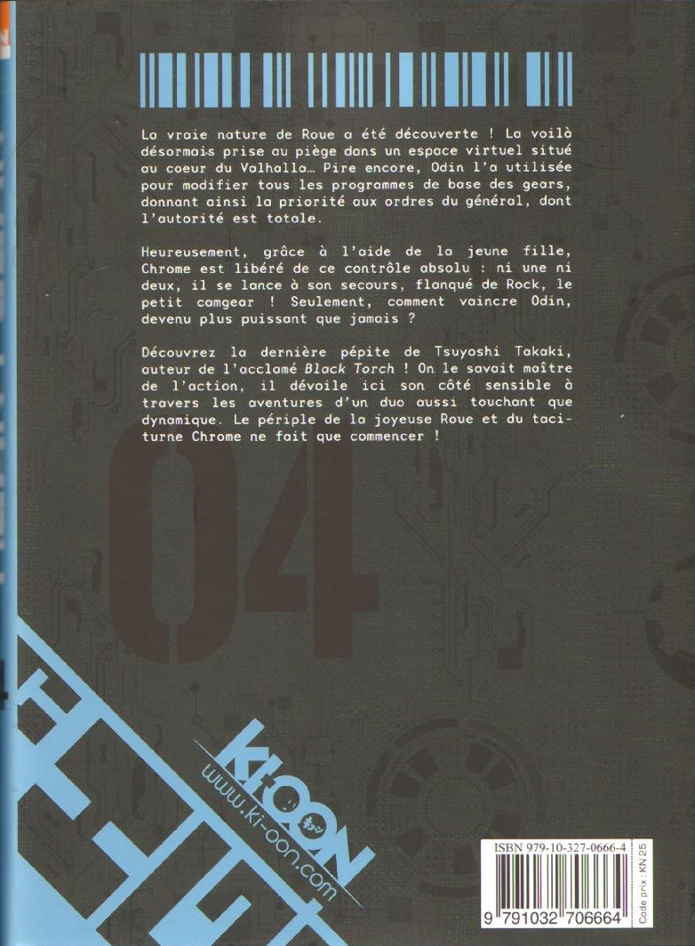 Découvrez la dernière pépite de Tsuyoshi Takaki, auteur de l'acclamé Black Torch ! On le savait maître de l'action, il dévoile ici son côté sensible à tra- vers les aventures d'un duo aussi touchant que dynamique. Le périple de la joyeuse Roue et du taciturne Chrome ne fait que commencer !