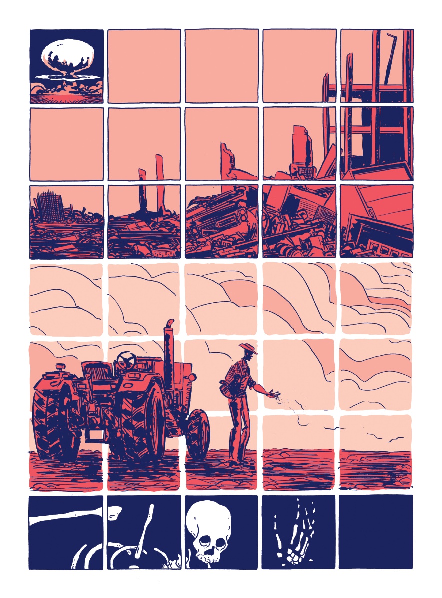 La narration étant dénuée de mots, les informations passent uniquement par l’image et le découpage. Le dessinateur a développé tout un langage visuel à la fois déconstruit et limpide. Planche-monde, illustrations mosaïques, actions qui traversent les pages et les cases, tout est bon pour faire avancer l’histoire. Car, oui, il s’agit bien d’une espèce de space opera à un seul personnage (plus quelques humanoïdes chafouins). L’héroïne explore l’ether, avant de se retrouver sur des terres étrangement familières. Fable post-apocalyptique façon Planète des Singes ou scénario boîte de Pandore annonciateur de malheurs à venir ? Comme pour la forme, tout est ouvert et laissé au bon plaisir du lecteur.