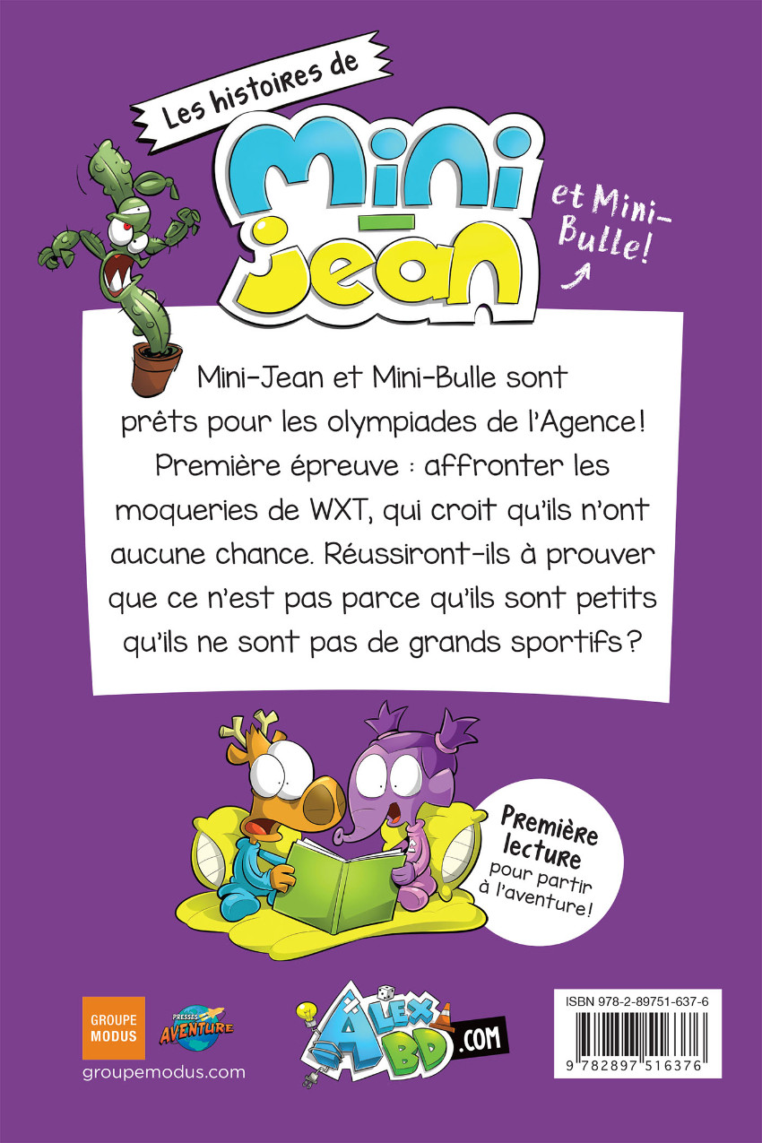 Résumé: Mini-Jean et Mini-Bulle sont prêts pour les olympiades de l’Agence! Première épreuve: affronter les moqueries de WXT, qui croit qu’ils n’ont aucune chance. Réussiront-ils à prouver que ce n’est pas parce qu’ils sont petits qu’ils ne sont pas de grands sportifs?