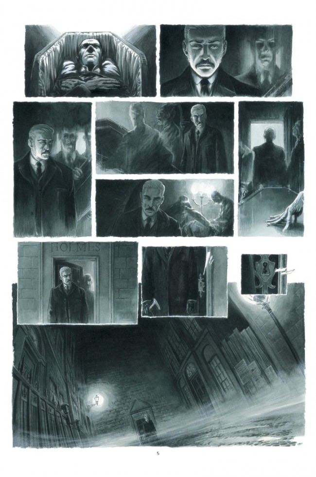 Depuis le début de cette surprenante série en 2006, Luc Brunschwig réalise la performance d’écorner l’image de Holmes tout en rendant hommage à Conan Doyle, son créateur, en offrant une enquête digne de l’illustre privé. Toujours sur un rythme lent, il emmène le lecteur pénétrer le passé de Sherlock, privilégiant l’ambiance, l’épaisseur des personnages et la précision des dialogues. Grâce à cette méticulosité et aux découvertes qui suscitent des questions, le récit s’avère toujours aussi prenant, voire, pour ce troisième tome, encore plus consistant. Le scénariste sépare les deux limiers – Watson et Wiggins –, offrant ainsi deux enquêtes. Celle menée par le jeune protégé du héros décédé permet d’en apprendre plus sur son enrôlement et fait apparaître un nouveau protagoniste – le docteur Parks – qui ne manque pas d’intérêt du fait de sa personnalité et de ses activités. L’autre élément nouveau est que le couple Watson est suivi par un individu qui prend ses ordres à Londres.