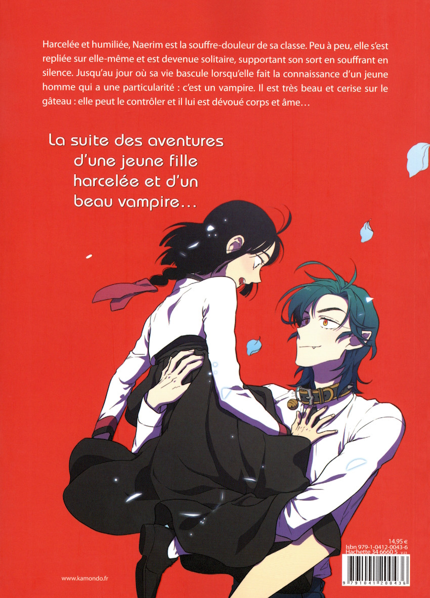 Résumé: Harcelée et humiliée, Naerim est la souffre-douleur de sa classe. Peu à peu, elle s'est repliée sur elle-même et est devenue solitaire, supportant son sort en souffrant en silence. Jusqu'au jour où sa vie bascule lorsqu'elle fait la connaissance d'un jeune homme qui a une particularité : c'est un vampire. Il est très beau et cerise sur le gâteau : elle peut le contrôler et lui est dévoué corps et âme... La suite des aventures d'une jeune fille harcelée et d'un beau vampire...