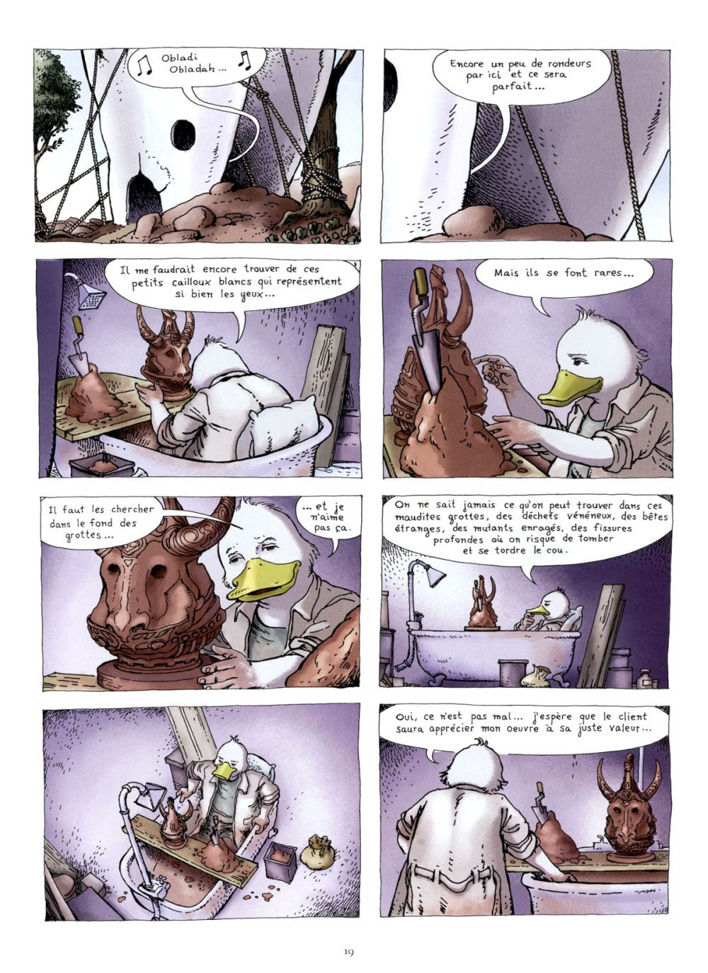J'ai failli arrêter ma lecture après le chapitre 1 tant j'avais une indigestion d'un charabia réellement pompeux. Puis, on fait la connaissance d'un personnage genre Donald Duck dans un paysage rappelant les toiles du grand peintre Dali où des coquillages flottent dans les airs. J'ai crû halluciner complètement ! Cependant, petit à petit, il s'est passé quelque chose au travers de cette lecture qui est comme une sorte de voyage initiatique dans un monde qui a perdu la connaissance de l'écriture. On a vite envie de percer le mystère de cette civilisation du futur baignée dans l'ignorance. Je regrette également l'utilisation d'un dessin trop naïf pour ce type d'histoire très intéressante avec une grande dose de philosophie. Je conseille cependant vivement la lecture de ce qui peut être qualifié comme une oeuvre avant-gardiste ou du moins d'un type nouveau.Le 26/03/2003 à 14:25:31