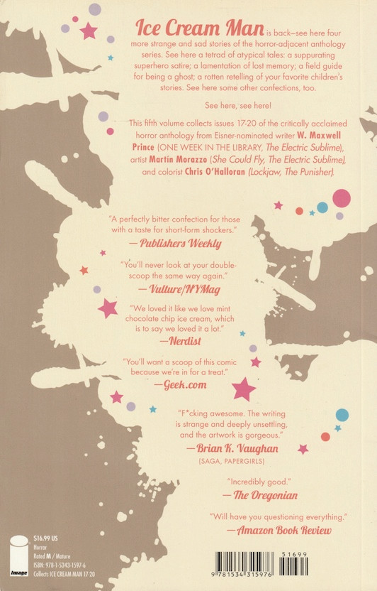 Résumé: See here four more strange and sad stories of thecritically lauded horror-adjacent anthology series, ICE CREAM MAN. Seehere a tetrad of atypical tales: a suppurating superhero satire; a lamentationof lost memory; a field guide for being a ghost; a rotten retelling of yourfavorite children's stories. See here some other confections, too. See here,see here!