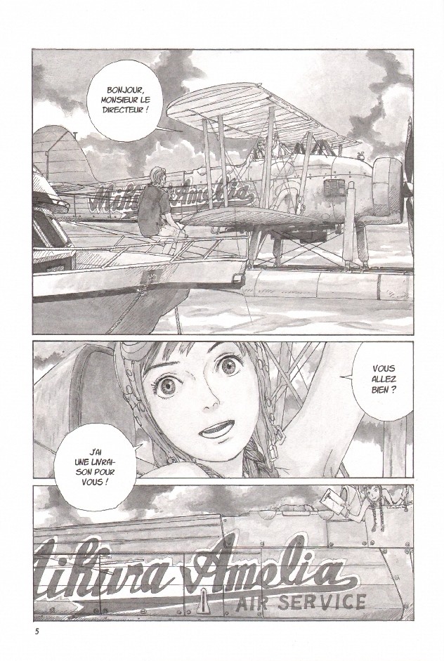 Précis avec ce qu’il faut de fragilité, le trait de Tsuruta possède toutes les qualités pour dépeindre cette quête initiatique assaisonnée aux saveurs « prattiennes ». Une dualité du style qui est parfaitement exploitée dans les innombrables portraits de la protagoniste principale (souvent très légèrement vêtue). Lascive et s’abandonnant, celle-ci aurait pu ressembler à une pin-up de bombardier. À la place, c’est sa délicatesse et son espièglerie qui dominent. Elle sait et fait ce qu’elle veut et c’est bien elle qui tient le manche à balai de son biplan. Et s’il le faut, elle n’hésite pas à mettre les mains dans le cambouis pour le rafistoler.