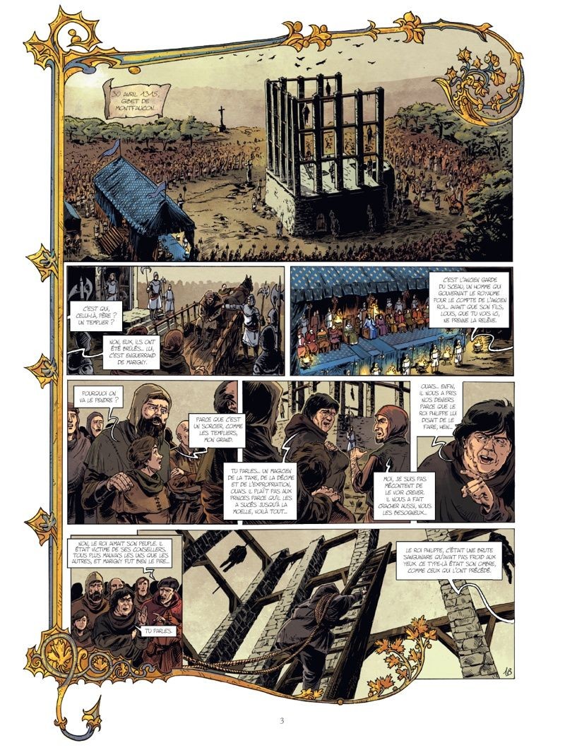 La narration parvient habilement à capter l'attention, bâtie comme un véritable thriller politique et proposant une représentation de la société médiévale du XIVe siècle des plus convaincantes. Sur ce dernier point, le graphisme de Christophe Regnault remplit parfaitement son office et fournit une reconstitution des lieux très pédagogique. Les pages consacrées aux intrigues et autres complots bénéficient de ses cadrages serrés et de son travail sur les expressions, tandis que le chaos et la sauvagerie se ressentent dans les scènes de combats.