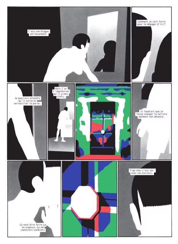 Cependant, c'est surtout le travail graphique qui sera assez remarquable si on va au-delà du minimalisme des images. En effet, c'est l'imbrication des couleurs notamment le rouge, vert et bleu qui forme une espèce de trame dans le récit pour partir sur la dématérialisation dans une sorte de réalité totalement instable. Par ailleurs, les dialogues plutôt courts sont mais diablement bien ajustés au milieu de toute cette colorimétrie.