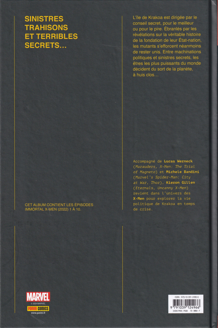 Résumé: Suite aux événements d'Inferno et de X Lives/X Deaths of Wolverine, l'ambiance n'est pas à la fête au sein du Conseil Secret de Krakoa, au point que Magnéto s'en va ! Qui va le remplacer ? Quels noirs présages Destinée voit-elle dans l'avenir ? Et lorsque les Éternels décident d'éliminer les mutants, le Conseil saura-t-il parler d'une même voix ? Cette série signe le retour de Kieron Gillen (Die, Eternals) dans l'univers des mutants. Il y explore les personnalités des différents membres du Conseil Secret, les mutants qui dirigent Krakoa. Les évènements d'AXE: Judgment Day auront bien sûr une part importante dans les décisions du groupe.