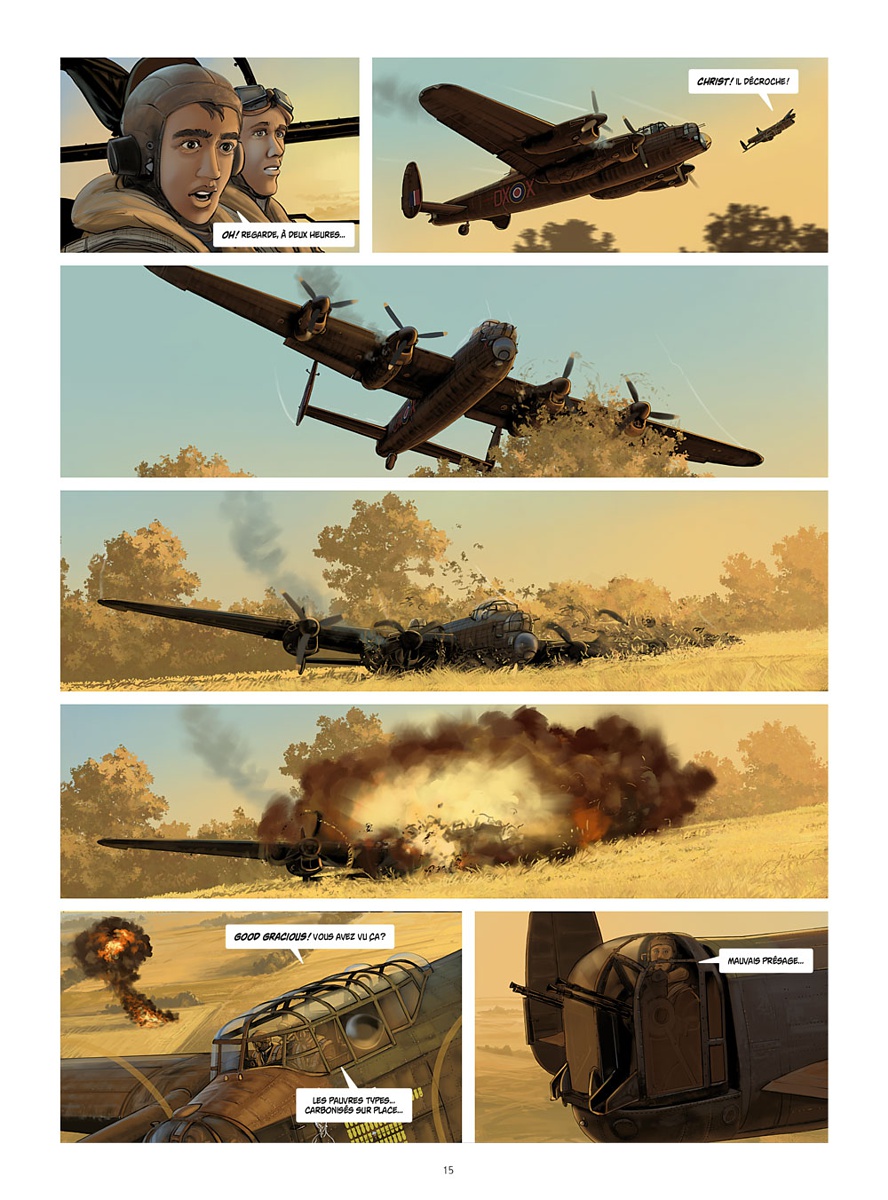 28 juillet 1943. L’équipage du bombardier Lancaster est de retour d’un raid sur Hambourg. Il pleut sur l’Angleterre… Alléluia ! Avec un peu de chance, pas de nouvelle mission ! Ouf ! Enfin, un peu de repos… Manque de bol, la météo prévoit une éclaircie… Nouvelle mission sur Hambourg, la troisième de suite… Voilà qui ne réjouit personne ! Les Fritz voient leur principal port brûler, la flak, déjà redoutable, s’est sûrement encore renforcée… Et si cela ne suffit pas, il y a les chasseurs de nuit… En route pour l’opération Gomorrhe ! Critique : Cet album nous fait vivre d’au plus près la vie d’un équipage de bombardier lourd de la RAF dans une de ses très périlleuses missions de nuit au-dessus de l’Allemagne. L’enfer, ces équipages le sèment dans la ville de Hambourg, mais eux-mêmes vivent des heures très périlleuses. Le danger provient aussi bien de l’artillerie anti-aérienne, que des avions de chasse ennemis, ou bien encore de la météo, sans oublier les problèmes techniques. Les pertes au sein des escadrilles de bombardiers étaient énormes. La RAF, plus expérimentée, bombardait essentiellement de nuit, alors que L’US Air Force bombardait de jour. Quelques images nous donnent un (très léger) aperçu de ce que pouvaient vivre les civils allemands. C’était un défi difficile à relever par le dessinateur que de rendre visible des opérations de nuit. Philippe Pinard l’a magnifiquement relevé. Le scénario d’Antoine Crespin est au plus proche de l’humain. Les amateurs d’histoire de l’aviation apprécieront, mais ce serait réducteur de limiter le lectorat à ce seul public. Chiffres officiels : 24 juillet 1943 : Opération Gomorrah sur Hambourg, 40 000 habitants tués, et 80 000 blessés…Le 21/08/2021 à 09:55:35